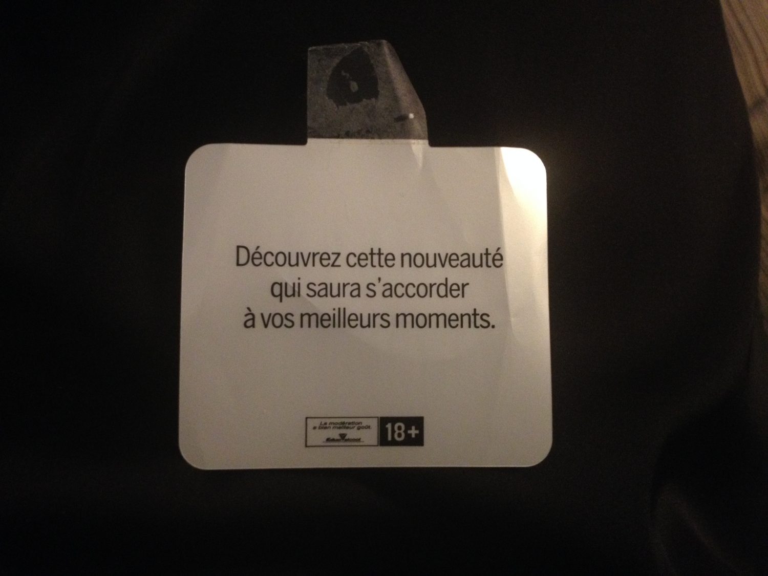 Pour terminer, j’ai trouvé l’affichage des nouveaux vins de la SAQ tout à fait à propos. Apposées sur les bouteilles de vin qu’on a achetées, on pourrait coller les étiquettes sur le chandail des nouveaux célibataires, question d’annoncer leurs couleurs !